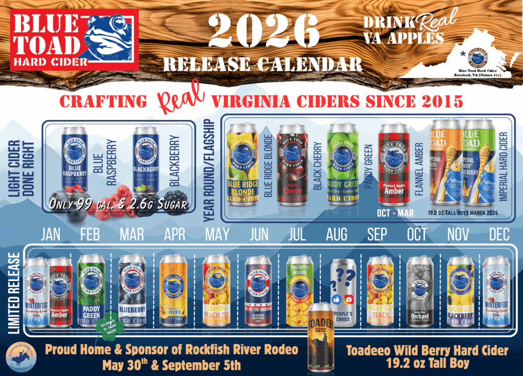 Join us at Blue Toad Hard Cider to experience the finest Virginia ciders crafted with passion and local ingredients. Whether you are a longtime fan or a first-time visitor, we can’t wait to share our love for local cider with you. Visit our taproom today and toast to exceptional flavor and unforgettable experiences!